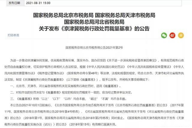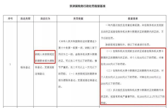 《京津冀税务行政处罚裁量基准》发布!新办营业执照不办理税务登记的,处2000元以下罚款,情节严重最高罚款一万元!